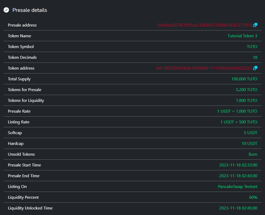 Here, you can view all the information regarding the operation of the presale, such as the generated contract, token information, start and end dates, listing rates, and exchanges to be listed on, the percentage of funds raised for liquidity, liquidity lock duration, among other details (Information may vary depending on the type of presale).