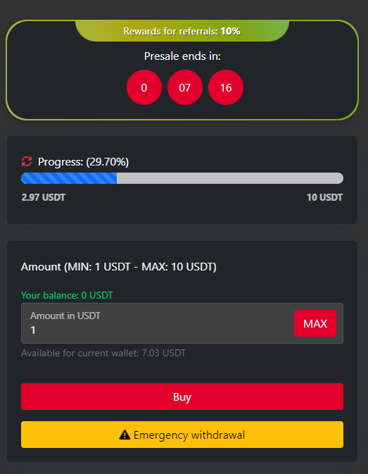 If the presale creator has indicated it, the rewards program may be available for users who wish to recommend the presale using a special link and thus earn rewards each time another investor makes a purchase through the shared link. General statistics will be displayed here, such as rewards generated by the connected wallet. Once the presale is completed by its owner, users with available rewards can claim them.