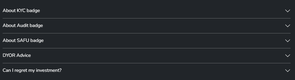 Here, the project creators have provided information about their project for you to investigate in detail. Below the token name, on the left, you have icons to access the website and social media, and on the right, badges are displayed (if applicable to the project), which, when clicked, lead to the corresponding documents. Then, there is a description and a promotional video, if the presale creator has added them.